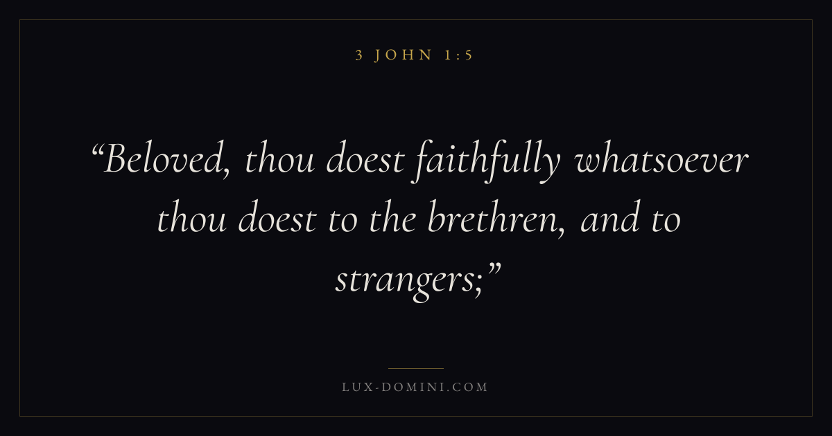 Books / 3 John / Chapter 1 / Verse 5 ← 3 John 1:4 3 John 1:5 3 John 1:6 → Beloved, thou doest faithfully whatsoever thou doest to the brethren, and to strangers; Download verse card Share on Twitter Share on Facebook Pin it ✦ Key themes LoveTruthHospitalityLeadership Read with 3 John 1:63 John 1:7John 3:161 Corinthians 13:4 Related topics Bible verses about loveBible verses about truthBible verses about leadership ✦ 3 John Chapter 1 verses V. 1 V. 2 V. 3 V. 4 V. 5 V. 6 V. 7 V. 8 V. 9 V. 10 V. 11 V. 12 V. 13 V. 14