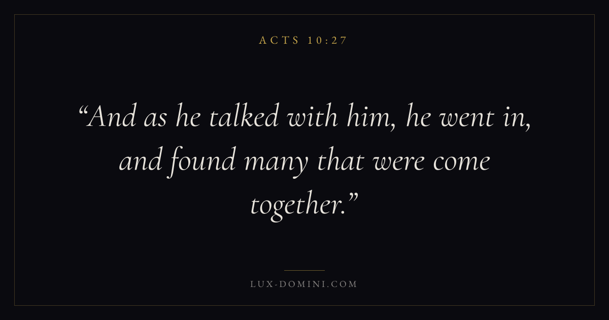 Books / Acts / Chapter 10 / Verse 27 ← Acts 10:26 Acts 10:27 Acts 10:28 → And as he talked with him, he went in, and found many that were come together. Download verse card Share on Twitter Share on Facebook Pin it ✦ Key themes Suffering and trialsPrayerWisdomTruthSpirit Read with Acts 10:25Acts 10:26Romans 8:182 Corinthians 4:17 Related topics Bible verses about suffering and trialsBible verses about prayerBible verses about wisdomBible verses about truth ✦ Acts Chapter 10 verses V. 1 V. 2 V. 3 V. 4 V. 5 V. 6 V. 7 V. 8 V. 9 V. 10 V. 11 V. 12 V. 13 V. 14 V. 15 V. 16 V. 17 V. 18 V. 19 V. 20 V. 21 V. 22 V. 23 V. 24 V. 25 V. 26 V. 27 V. 28 V. 29 V. 30 V. 31 V. 32 V. 33 V. 34 V. 35 V. 36 V. 37 V. 38 V. 39 V. 40 V. 41 V. 42 V. 43 V. 44 V. 45 V. 46 V. 47 V. 48