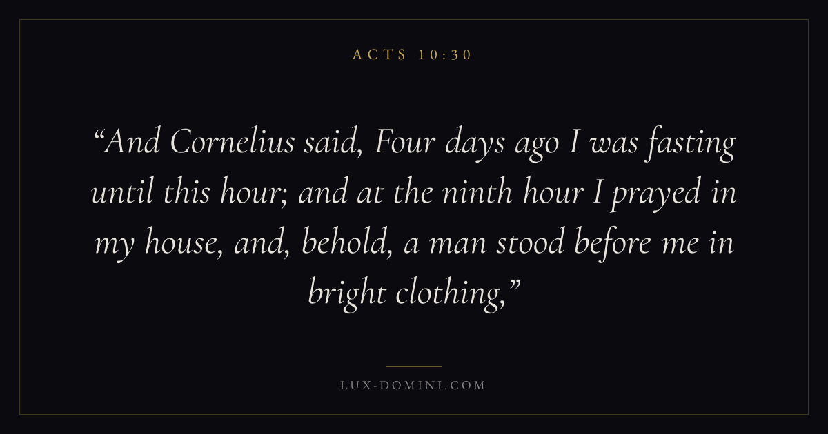 And Cornelius said, Four days ago I was fasting until this hour; and at the ninth hour I prayed in my house, and, behold, a man stood before me in bright clothing,