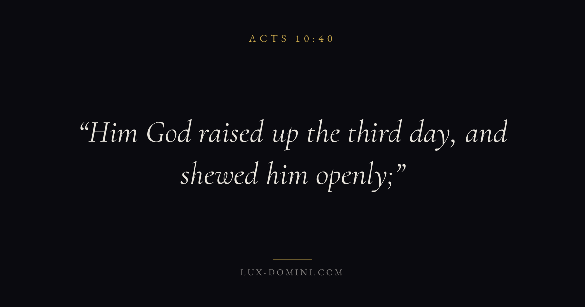 Books / Acts / Chapter 10 / Verse 40 ← Acts 10:39 Acts 10:40 Acts 10:41 → Him God raised up the third day, and shewed him openly; Download verse card Share on Twitter Share on Facebook Pin it ✦ Key themes Anxiety and fearSuffering and trialsPrayerJustice and mercySpirit Read with Acts 10:36Acts 10:37Philippians 4:6Isaiah 41:10 Related topics Bible verses about anxiety and fearBible verses about suffering and trialsBible verses about prayerBible verses about justice and mercy ✦ Acts Chapter 10 verses V. 1 V. 2 V. 3 V. 4 V. 5 V. 6 V. 7 V. 8 V. 9 V. 10 V. 11 V. 12 V. 13 V. 14 V. 15 V. 16 V. 17 V. 18 V. 19 V. 20 V. 21 V. 22 V. 23 V. 24 V. 25 V. 26 V. 27 V. 28 V. 29 V. 30 V. 31 V. 32 V. 33 V. 34 V. 35 V. 36 V. 37 V. 38 V. 39 V. 40 V. 41 V. 42 V. 43 V. 44 V. 45 V. 46 V. 47 V. 48