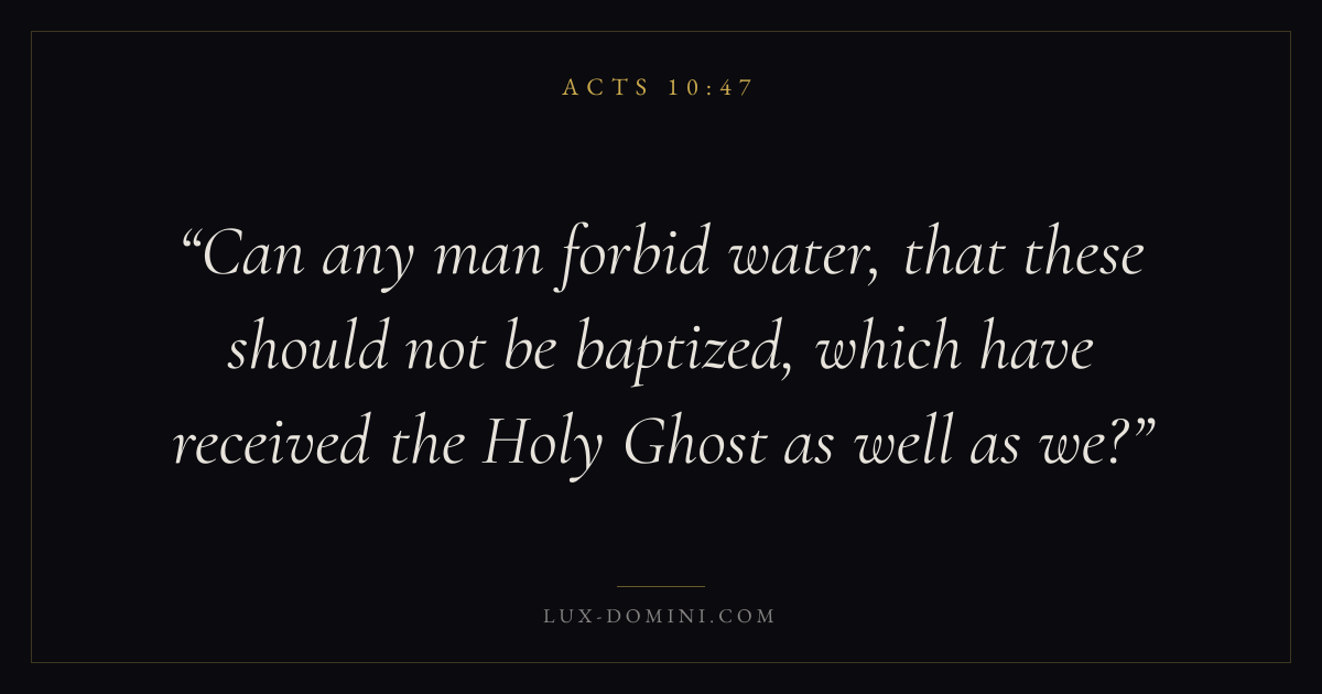 Can any man forbid water, that these should not be baptized, which have received the Holy Ghost as well as we?