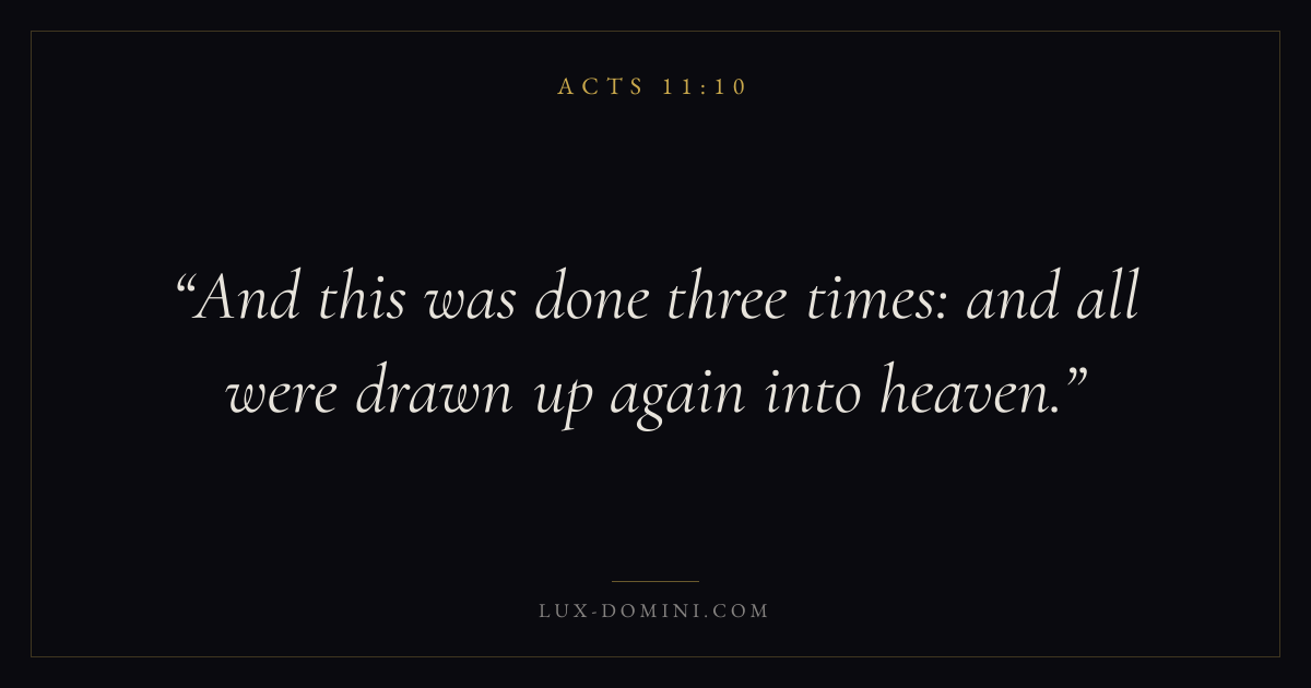 Books / Acts / Chapter 11 / Verse 10 ← Acts 11:9 Acts 11:10 Acts 11:11 → And this was done three times: and all were drawn up again into heaven. Download verse card Share on Twitter Share on Facebook Pin it ✦ Key themes Suffering and trialsPrayerTruthSpirit Read with Acts 11:6Acts 11:7Romans 8:182 Corinthians 4:17 Related topics Bible verses about suffering and trialsBible verses about prayerBible verses about truth ✦ Acts Chapter 11 verses V. 1 V. 2 V. 3 V. 4 V. 5 V. 6 V. 7 V. 8 V. 9 V. 10 V. 11 V. 12 V. 13 V. 14 V. 15 V. 16 V. 17 V. 18 V. 19 V. 20 V. 21 V. 22 V. 23 V. 24 V. 25 V. 26 V. 27 V. 28 V. 29 V. 30