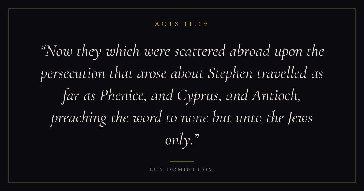 Now they which were scattered abroad upon the persecution that arose about Stephen travelled as far as Phenice, and Cyprus, and Antioch, preaching the word to none but unto the Jews only.