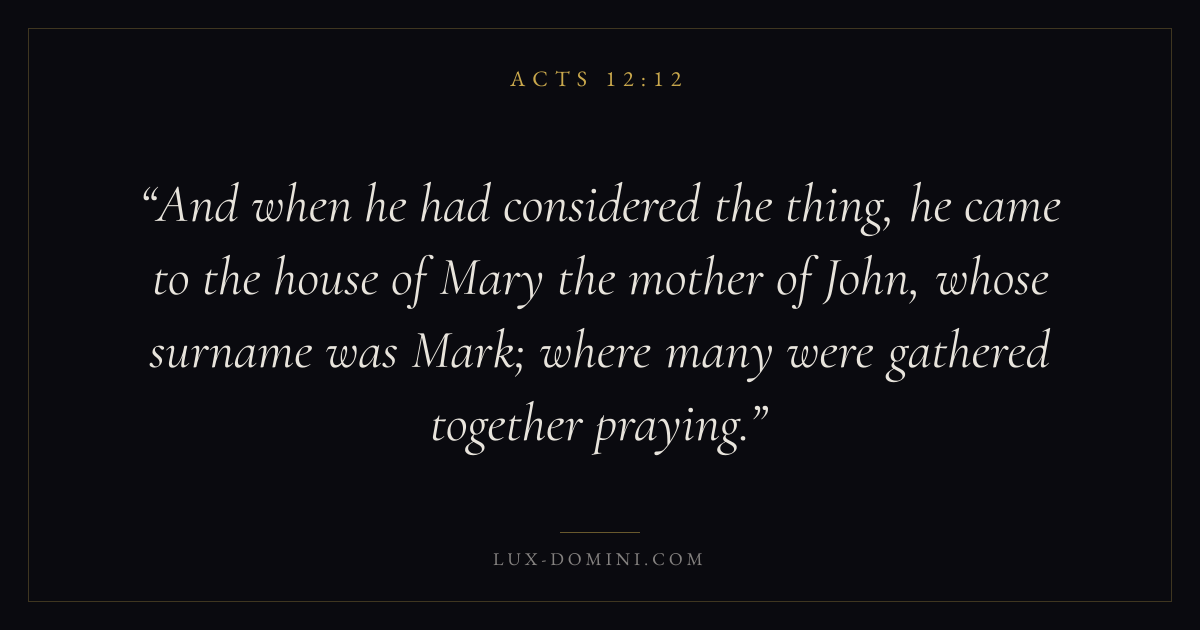And when he had considered the thing, he came to the house of Mary the mother of John, whose surname was Mark; where many were gathered together praying.