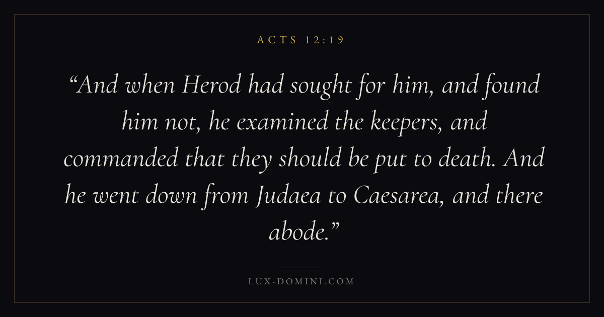 And when Herod had sought for him, and found him not, he examined the keepers, and commanded that they should be put to death. And he went down from Judaea to Caesarea, and there abode.