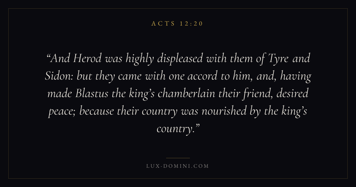 And Herod was highly displeased with them of Tyre and Sidon: but they came with one accord to him, and, having made Blastus the king’s chamberlain their friend, desired peace; because their country was nourished by the king’s country.