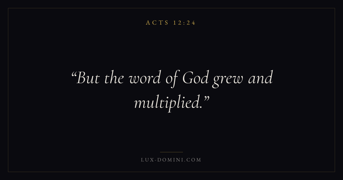 Books / Acts / Chapter 12 / Verse 24 ← Acts 12:23 Acts 12:24 Acts 12:25 → But the word of God grew and multiplied. Download verse card Share on Twitter Share on Facebook Pin it ✦ Key themes Suffering and trialsPrayerHumilityTruthSpirit Read with Acts 12:25Romans 8:182 Corinthians 4:17Matthew 6:9 Related topics Bible verses about suffering and trialsBible verses about prayerBible verses about humilityBible verses about truth ✦ Acts Chapter 12 verses V. 1 V. 2 V. 3 V. 4 V. 5 V. 6 V. 7 V. 8 V. 9 V. 10 V. 11 V. 12 V. 13 V. 14 V. 15 V. 16 V. 17 V. 18 V. 19 V. 20 V. 21 V. 22 V. 23 V. 24 V. 25