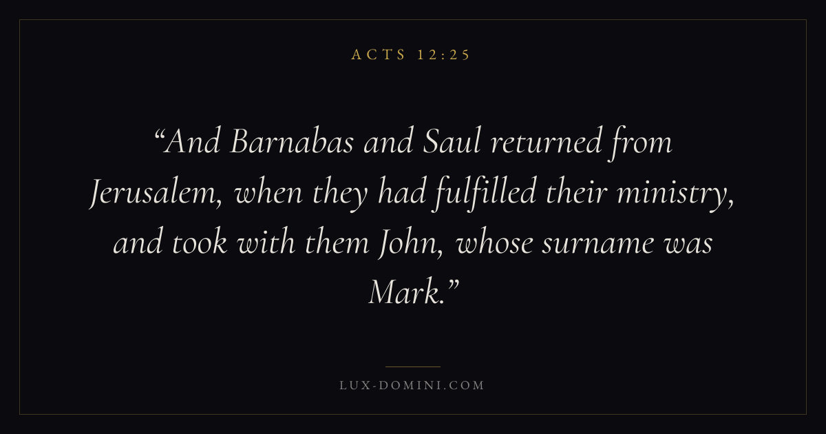 And Barnabas and Saul returned from Jerusalem, when they had fulfilled their ministry, and took with them John, whose surname was Mark.