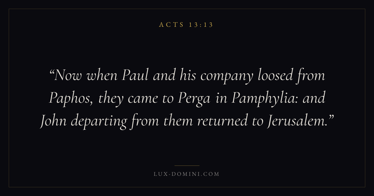 Now when Paul and his company loosed from Paphos, they came to Perga in Pamphylia: and John departing from them returned to Jerusalem.