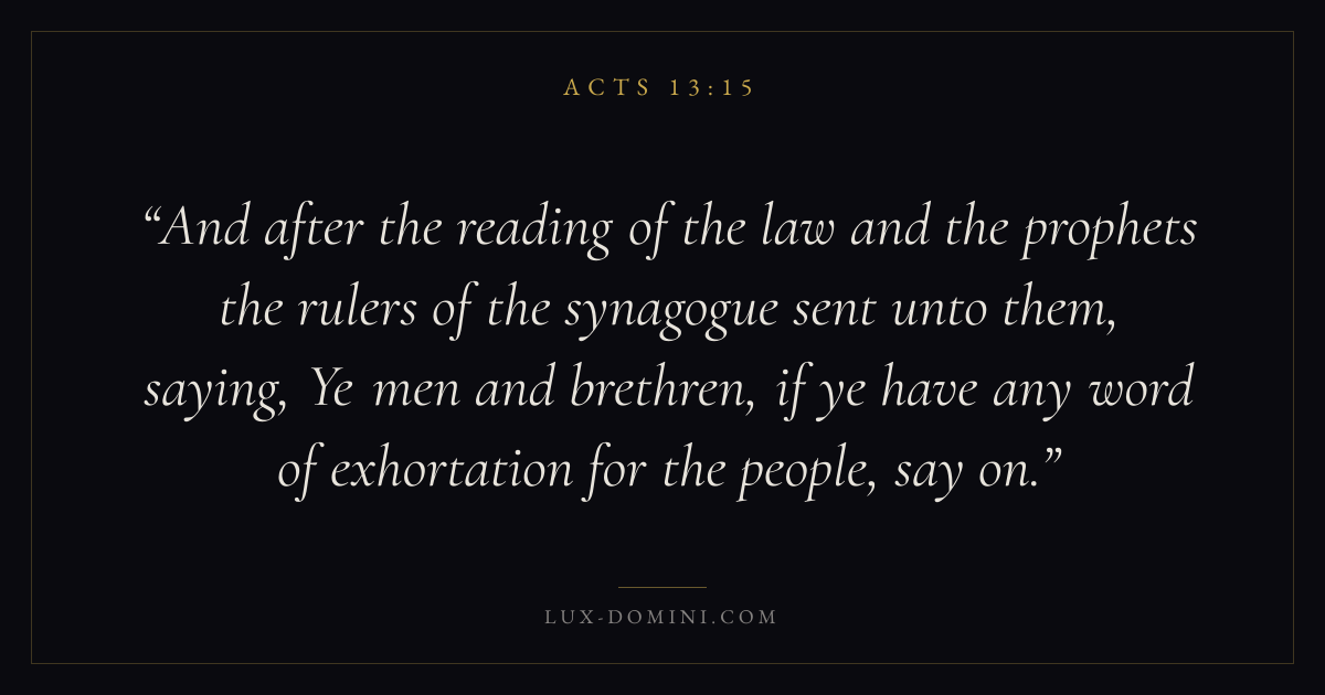 And after the reading of the law and the prophets the rulers of the synagogue sent unto them, saying, Ye men and brethren, if ye have any word of exhortation for the people, say on.