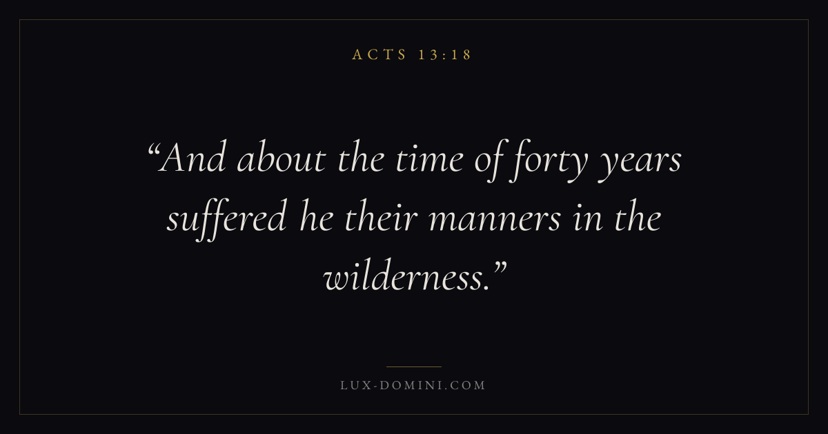 Books / Acts / Chapter 13 / Verse 18 ← Acts 13:17 Acts 13:18 Acts 13:19 → And about the time of forty years suffered he their manners in the wilderness. Download verse card Share on Twitter Share on Facebook Pin it ✦ Key themes Suffering and trialsPrayerTruthSpirit Read with Acts 13:17Acts 13:19Romans 8:182 Corinthians 4:17 Related topics Bible verses about suffering and trialsBible verses about prayerBible verses about truth ✦ Acts Chapter 13 verses V. 1 V. 2 V. 3 V. 4 V. 5 V. 6 V. 7 V. 8 V. 9 V. 10 V. 11 V. 12 V. 13 V. 14 V. 15 V. 16 V. 17 V. 18 V. 19 V. 20 V. 21 V. 22 V. 23 V. 24 V. 25 V. 26 V. 27 V. 28 V. 29 V. 30 V. 31 V. 32 V. 33 V. 34 V. 35 V. 36 V. 37 V. 38 V. 39 V. 40 V. 41 V. 42 V. 43 V. 44 V. 45 V. 46 V. 47 V. 48 V. 49 V. 50 V. 51 V. 52