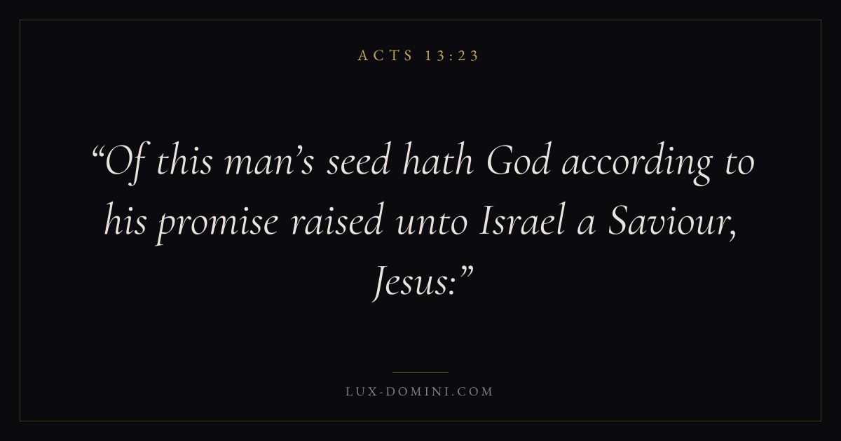 Books / Acts / Chapter 13 / Verse 23 ← Acts 13:22 Acts 13:23 Acts 13:24 → Of this man’s seed hath God according to his promise raised unto Israel a Saviour, Jesus: Download verse card Share on Twitter Share on Facebook Pin it ✦ Key themes HopeSuffering and trialsPrayerTruthSpirit Read with Acts 13:22Acts 13:24Romans 8:24Revelation 21:4 Related topics Bible verses about hopeBible verses about suffering and trialsBible verses about prayerBible verses about truth ✦ Acts Chapter 13 verses V. 1 V. 2 V. 3 V. 4 V. 5 V. 6 V. 7 V. 8 V. 9 V. 10 V. 11 V. 12 V. 13 V. 14 V. 15 V. 16 V. 17 V. 18 V. 19 V. 20 V. 21 V. 22 V. 23 V. 24 V. 25 V. 26 V. 27 V. 28 V. 29 V. 30 V. 31 V. 32 V. 33 V. 34 V. 35 V. 36 V. 37 V. 38 V. 39 V. 40 V. 41 V. 42 V. 43 V. 44 V. 45 V. 46 V. 47 V. 48 V. 49 V. 50 V. 51 V. 52