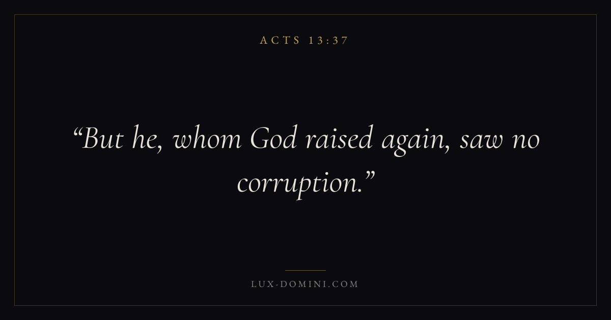 Books / Acts / Chapter 13 / Verse 37 ← Acts 13:36 Acts 13:37 Acts 13:38 → But he, whom God raised again, saw no corruption. Download verse card Share on Twitter Share on Facebook Pin it ✦ Key themes Suffering and trialsPrayerEternal lifeTruthSpirit Read with Acts 13:36Romans 8:182 Corinthians 4:17Matthew 6:9 Related topics Bible verses about suffering and trialsBible verses about prayerBible verses about eternal lifeBible verses about truth ✦ Acts Chapter 13 verses V. 1 V. 2 V. 3 V. 4 V. 5 V. 6 V. 7 V. 8 V. 9 V. 10 V. 11 V. 12 V. 13 V. 14 V. 15 V. 16 V. 17 V. 18 V. 19 V. 20 V. 21 V. 22 V. 23 V. 24 V. 25 V. 26 V. 27 V. 28 V. 29 V. 30 V. 31 V. 32 V. 33 V. 34 V. 35 V. 36 V. 37 V. 38 V. 39 V. 40 V. 41 V. 42 V. 43 V. 44 V. 45 V. 46 V. 47 V. 48 V. 49 V. 50 V. 51 V. 52
