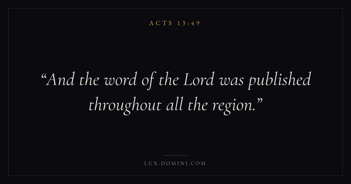 Books / Acts / Chapter 13 / Verse 49 ← Acts 13:48 Acts 13:49 Acts 13:50 → And the word of the Lord was published throughout all the region. Download verse card Share on Twitter Share on Facebook Pin it ✦ Key themes Suffering and trialsPrayerTruthSpirit Read with Acts 13:50Acts 13:51Romans 8:182 Corinthians 4:17 Related topics Bible verses about suffering and trialsBible verses about prayerBible verses about truth ✦ Acts Chapter 13 verses V. 1 V. 2 V. 3 V. 4 V. 5 V. 6 V. 7 V. 8 V. 9 V. 10 V. 11 V. 12 V. 13 V. 14 V. 15 V. 16 V. 17 V. 18 V. 19 V. 20 V. 21 V. 22 V. 23 V. 24 V. 25 V. 26 V. 27 V. 28 V. 29 V. 30 V. 31 V. 32 V. 33 V. 34 V. 35 V. 36 V. 37 V. 38 V. 39 V. 40 V. 41 V. 42 V. 43 V. 44 V. 45 V. 46 V. 47 V. 48 V. 49 V. 50 V. 51 V. 52