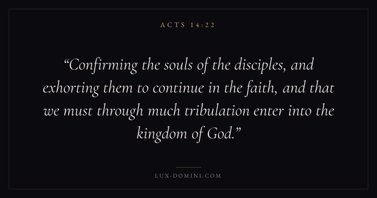 Confirming the souls of the disciples, and exhorting them to continue in the faith, and that we must through much tribulation enter into the kingdom of God.