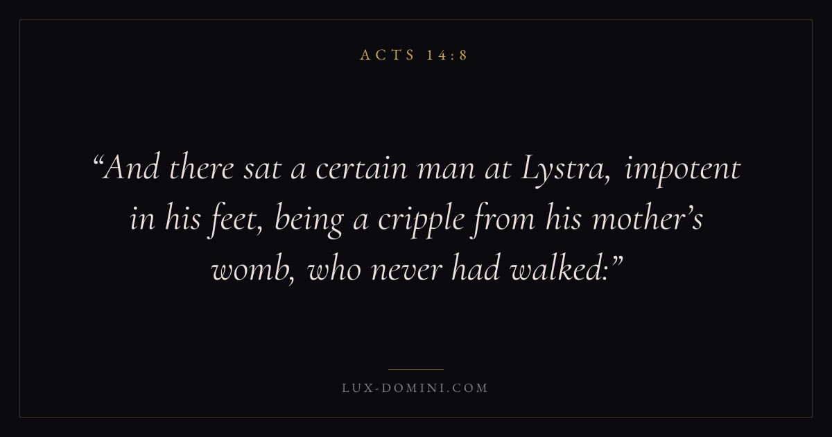 And there sat a certain man at Lystra, impotent in his feet, being a cripple from his mother’s womb, who never had walked: