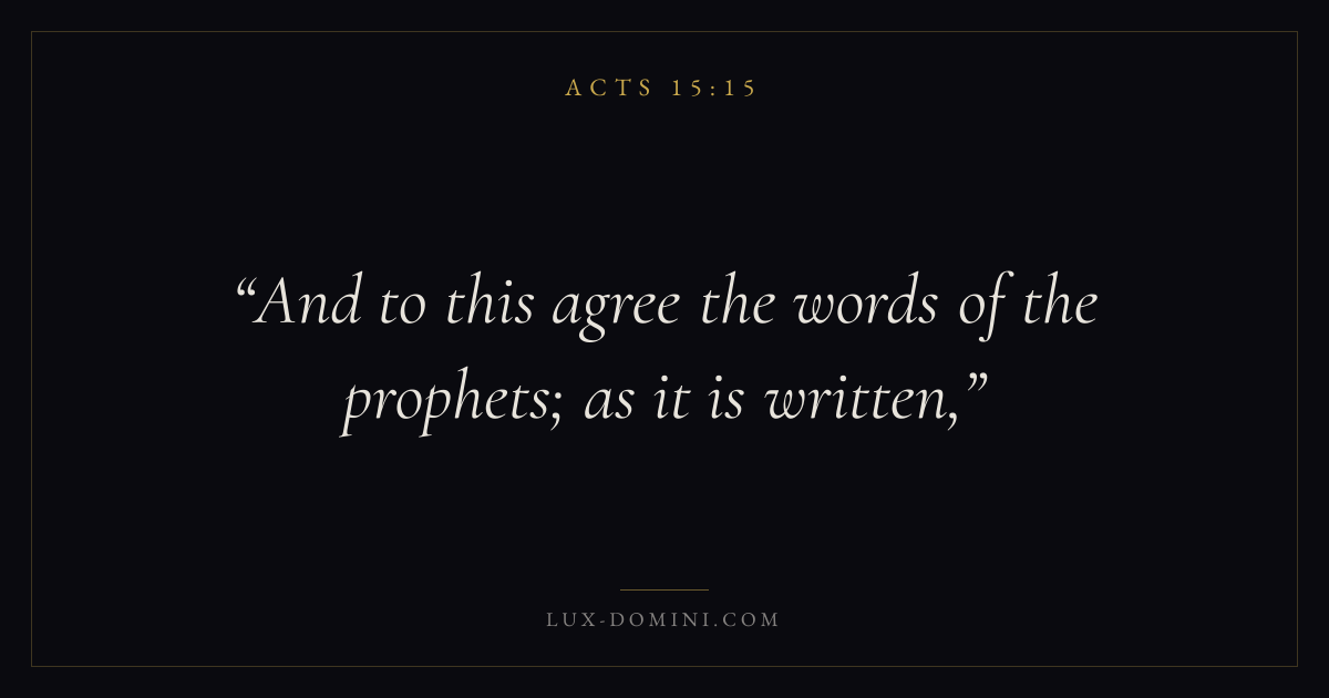 Books / Acts / Chapter 15 / Verse 15 ← Acts 15:14 Acts 15:15 Acts 15:16 → And to this agree the words of the prophets; as it is written, Download verse card Share on Twitter Share on Facebook Pin it ✦ Key themes FaithSuffering and trialsPrayerGraceSpirit Read with Acts 15:13Acts 15:14Hebrews 11:1Romans 10:17 Related topics Bible verses about faithBible verses about suffering and trialsBible verses about prayerBible verses about grace ✦ Acts Chapter 15 verses V. 1 V. 2 V. 3 V. 4 V. 5 V. 6 V. 7 V. 8 V. 9 V. 10 V. 11 V. 12 V. 13 V. 14 V. 15 V. 16 V. 17 V. 18 V. 19 V. 20 V. 21 V. 22 V. 23 V. 24 V. 25 V. 26 V. 27 V. 28 V. 29 V. 30 V. 31 V. 32 V. 33 V. 34 V. 35 V. 36 V. 37 V. 38 V. 39 V. 40 V. 41