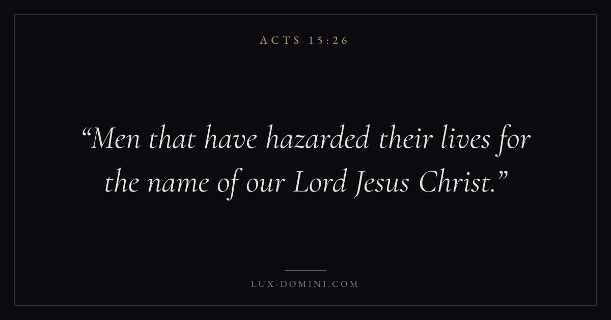 Books / Acts / Chapter 15 / Verse 26 ← Acts 15:25 Acts 15:26 Acts 15:27 → Men that have hazarded their lives for the name of our Lord Jesus Christ. Download verse card Share on Twitter Share on Facebook Pin it ✦ Key themes Suffering and trialsPrayerTruthSpirit Read with Acts 15:23Acts 15:24Romans 8:182 Corinthians 4:17 Related topics Bible verses about suffering and trialsBible verses about prayerBible verses about truth ✦ Acts Chapter 15 verses V. 1 V. 2 V. 3 V. 4 V. 5 V. 6 V. 7 V. 8 V. 9 V. 10 V. 11 V. 12 V. 13 V. 14 V. 15 V. 16 V. 17 V. 18 V. 19 V. 20 V. 21 V. 22 V. 23 V. 24 V. 25 V. 26 V. 27 V. 28 V. 29 V. 30 V. 31 V. 32 V. 33 V. 34 V. 35 V. 36 V. 37 V. 38 V. 39 V. 40 V. 41