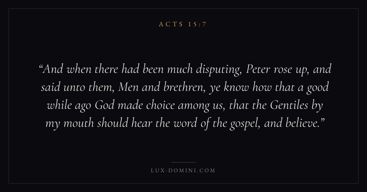 And when there had been much disputing, Peter rose up, and said unto them, Men and brethren, ye know how that a good while ago God made choice among us, that the Gentiles by my mouth should hear the word of the gospel, and believe.