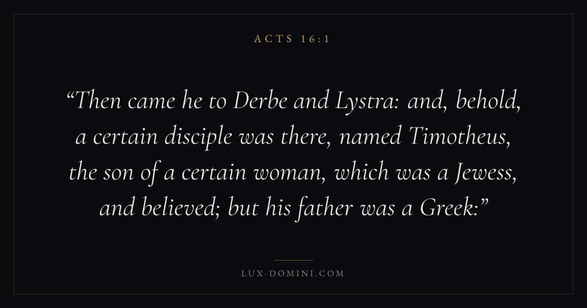 Then came he to Derbe and Lystra: and, behold, a certain disciple was there, named Timotheus, the son of a certain woman, which was a Jewess, and believed; but his father was a Greek: