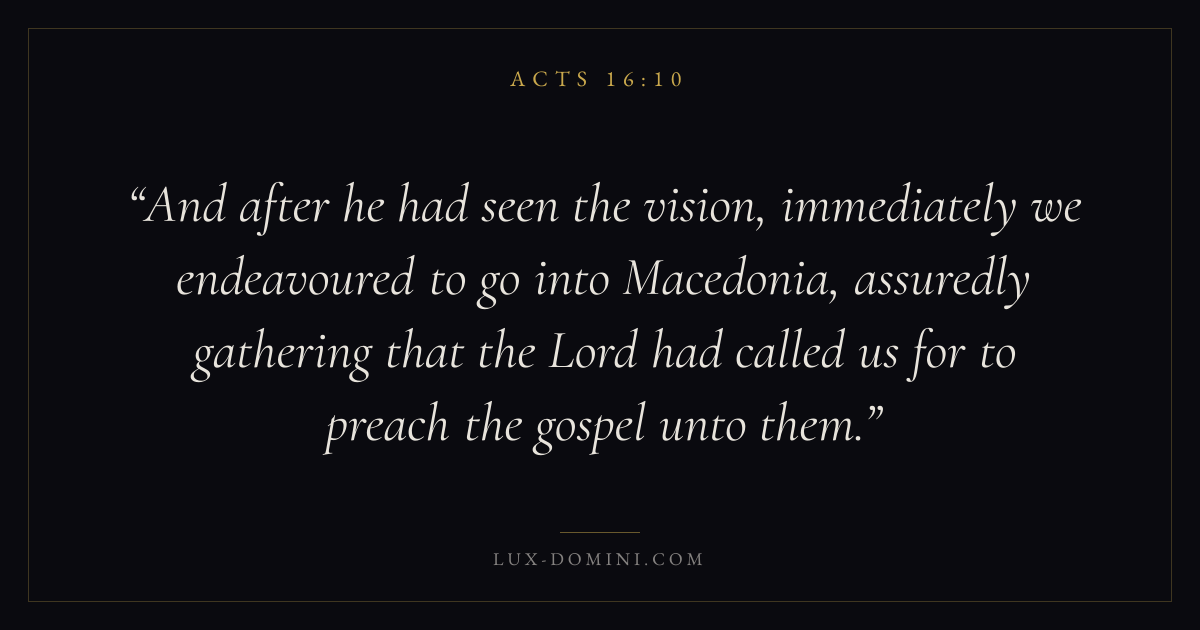 And after he had seen the vision, immediately we endeavoured to go into Macedonia, assuredly gathering that the Lord had called us for to preach the gospel unto them.