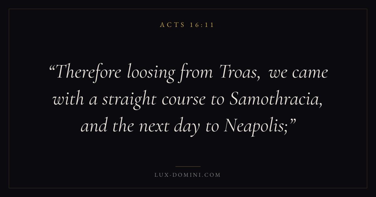 Therefore loosing from Troas, we came with a straight course to Samothracia, and the next day to Neapolis;
