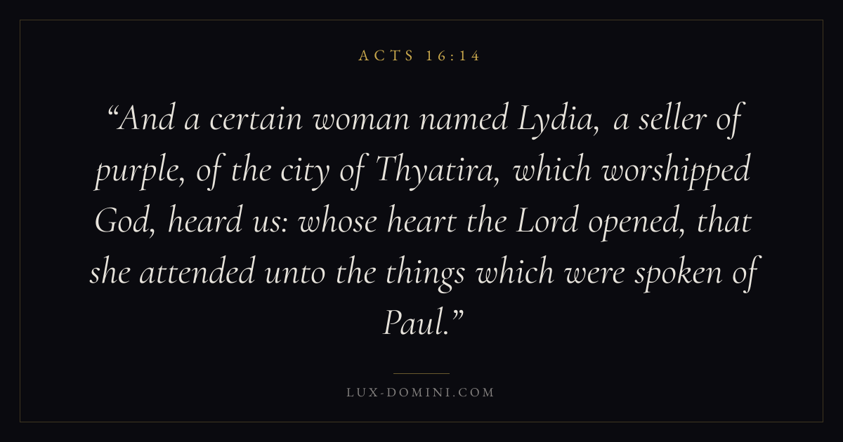 And a certain woman named Lydia, a seller of purple, of the city of Thyatira, which worshipped God, heard us: whose heart the Lord opened, that she attended unto the things which were spoken of Paul.