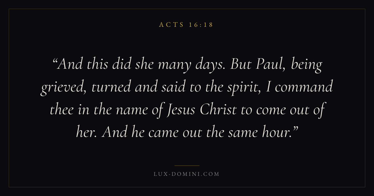 And this did she many days. But Paul, being grieved, turned and said to the spirit, I command thee in the name of Jesus Christ to come out of her. And he came out the same hour.