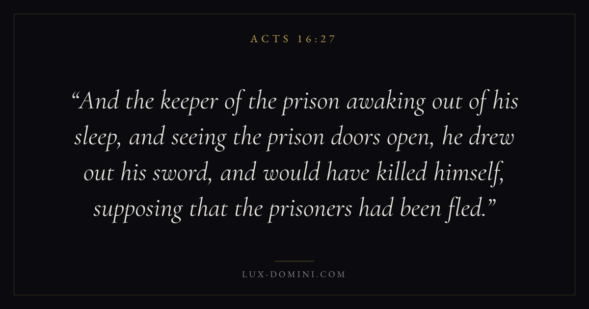 And the keeper of the prison awaking out of his sleep, and seeing the prison doors open, he drew out his sword, and would have killed himself, supposing that the prisoners had been fled.