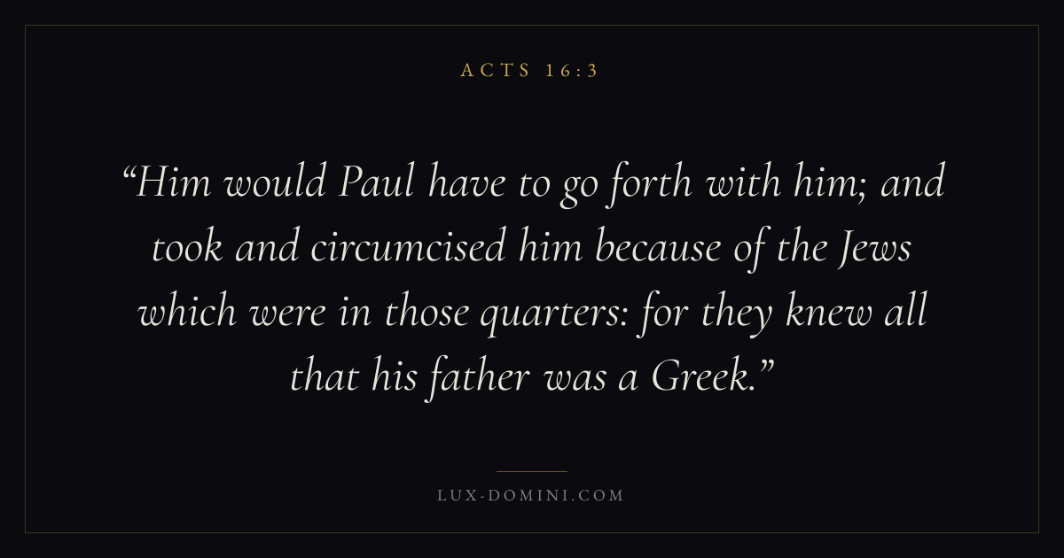 Him would Paul have to go forth with him; and took and circumcised him because of the Jews which were in those quarters: for they knew all that his father was a Greek.