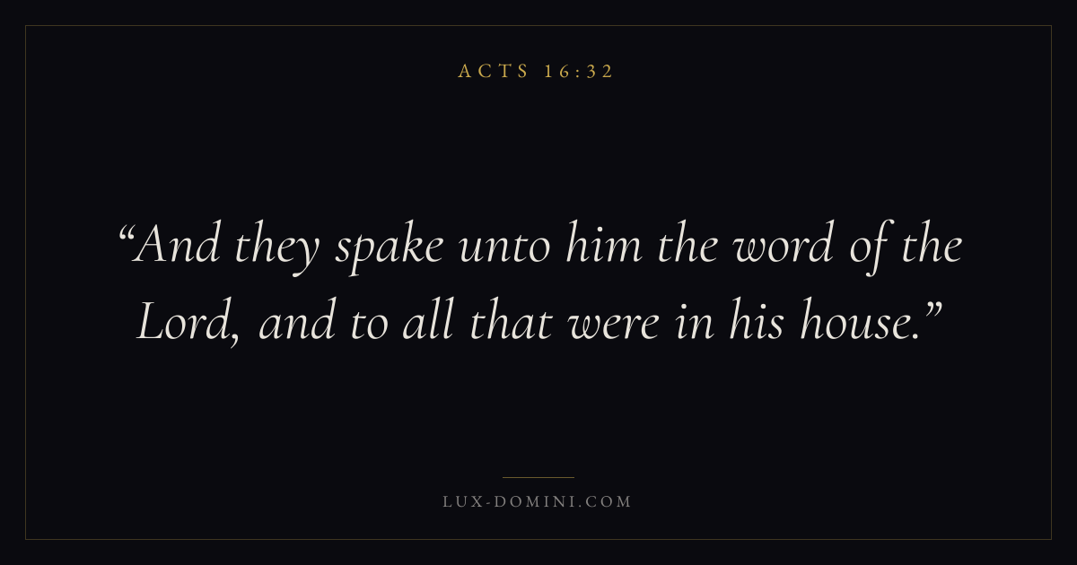 Books / Acts / Chapter 16 / Verse 32 ← Acts 16:31 Acts 16:32 Acts 16:33 → And they spake unto him the word of the Lord, and to all that were in his house. Download verse card Share on Twitter Share on Facebook Pin it ✦ Key themes Suffering and trialsPrayerTruthSpirit Read with Acts 16:30Acts 16:31Romans 8:182 Corinthians 4:17 Related topics Bible verses about suffering and trialsBible verses about prayerBible verses about truth ✦ Acts Chapter 16 verses V. 1 V. 2 V. 3 V. 4 V. 5 V. 6 V. 7 V. 8 V. 9 V. 10 V. 11 V. 12 V. 13 V. 14 V. 15 V. 16 V. 17 V. 18 V. 19 V. 20 V. 21 V. 22 V. 23 V. 24 V. 25 V. 26 V. 27 V. 28 V. 29 V. 30 V. 31 V. 32 V. 33 V. 34 V. 35 V. 36 V. 37 V. 38 V. 39 V. 40