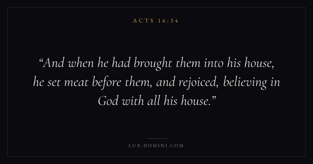 And when he had brought them into his house, he set meat before them, and rejoiced, believing in God with all his house.