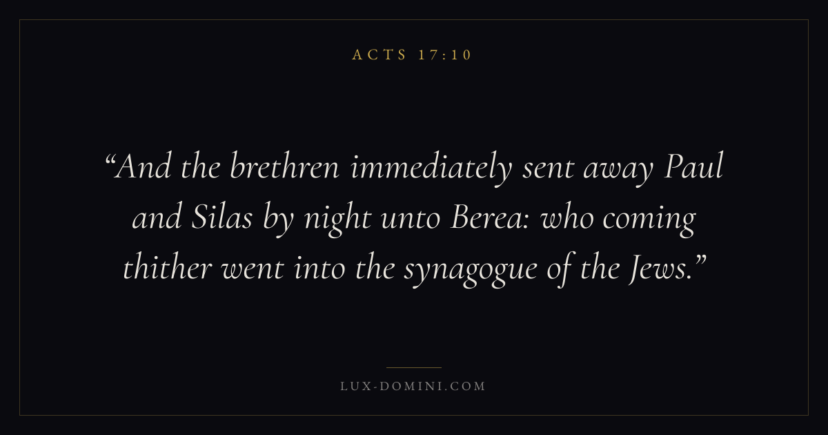 And the brethren immediately sent away Paul and Silas by night unto Berea: who coming thither went into the synagogue of the Jews.