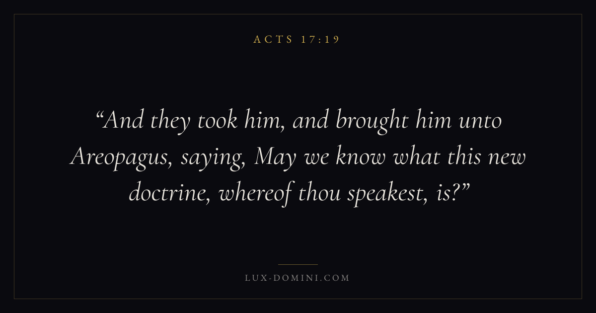 And they took him, and brought him unto Areopagus, saying, May we know what this new doctrine, whereof thou speakest, is?