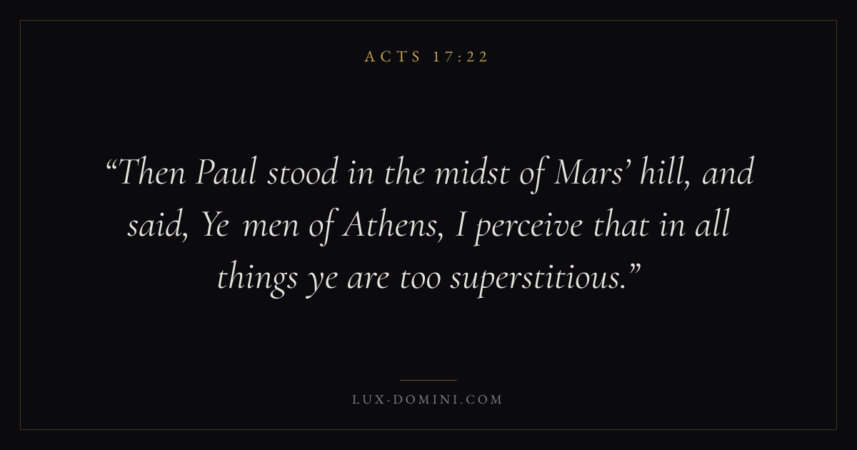 Then Paul stood in the midst of Mars’ hill, and said, Ye men of Athens, I perceive that in all things ye are too superstitious.