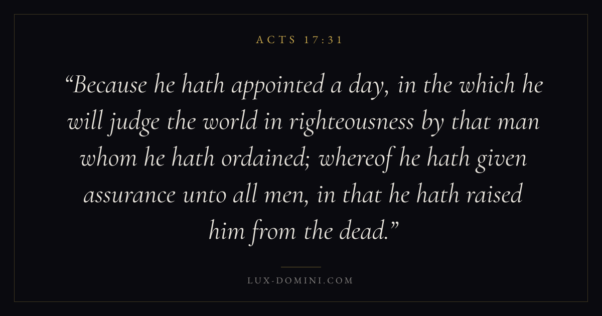 Because he hath appointed a day, in the which he will judge the world in righteousness by that man whom he hath ordained; whereof he hath given assurance unto all men, in that he hath raised him from the dead.