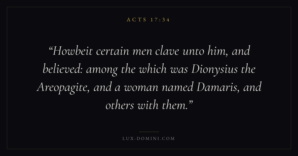 Howbeit certain men clave unto him, and believed: among the which was Dionysius the Areopagite, and a woman named Damaris, and others with them.