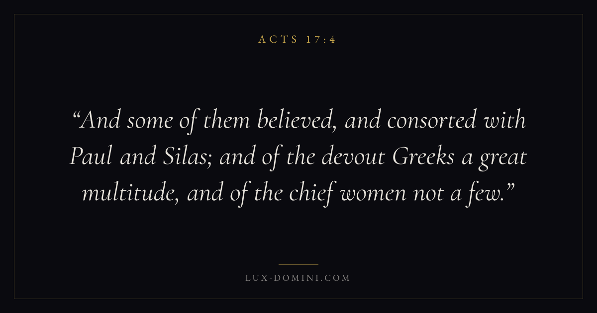 And some of them believed, and consorted with Paul and Silas; and of the devout Greeks a great multitude, and of the chief women not a few.