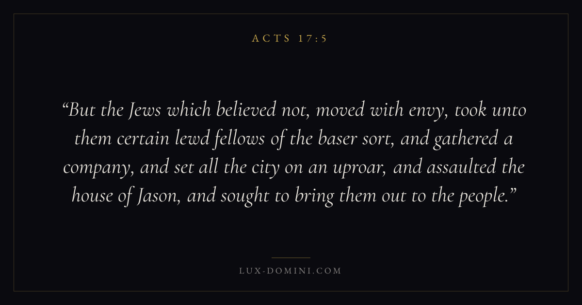 But the Jews which believed not, moved with envy, took unto them certain lewd fellows of the baser sort, and gathered a company, and set all the city on an uproar, and assaulted the house of Jason, and sought to bring them out to the people.