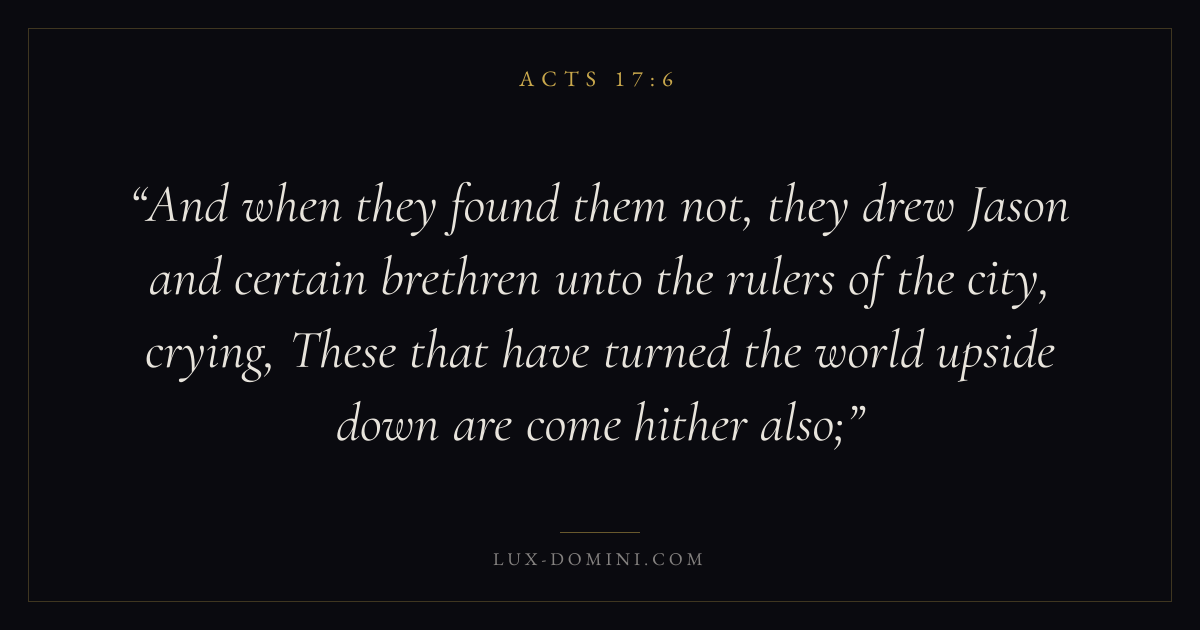 And when they found them not, they drew Jason and certain brethren unto the rulers of the city, crying, These that have turned the world upside down are come hither also;