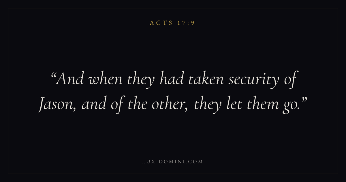 Books / Acts / Chapter 17 / Verse 9 ← Acts 17:8 Acts 17:9 Acts 17:10 → And when they had taken security of Jason, and of the other, they let them go. Download verse card Share on Twitter Share on Facebook Pin it ✦ Key themes Suffering and trialsPrayerTruthSpirit Read with Acts 17:5Acts 17:6Romans 8:182 Corinthians 4:17 Related topics Bible verses about suffering and trialsBible verses about prayerBible verses about truth ✦ Acts Chapter 17 verses V. 1 V. 2 V. 3 V. 4 V. 5 V. 6 V. 7 V. 8 V. 9 V. 10 V. 11 V. 12 V. 13 V. 14 V. 15 V. 16 V. 17 V. 18 V. 19 V. 20 V. 21 V. 22 V. 23 V. 24 V. 25 V. 26 V. 27 V. 28 V. 29 V. 30 V. 31 V. 32 V. 33 V. 34