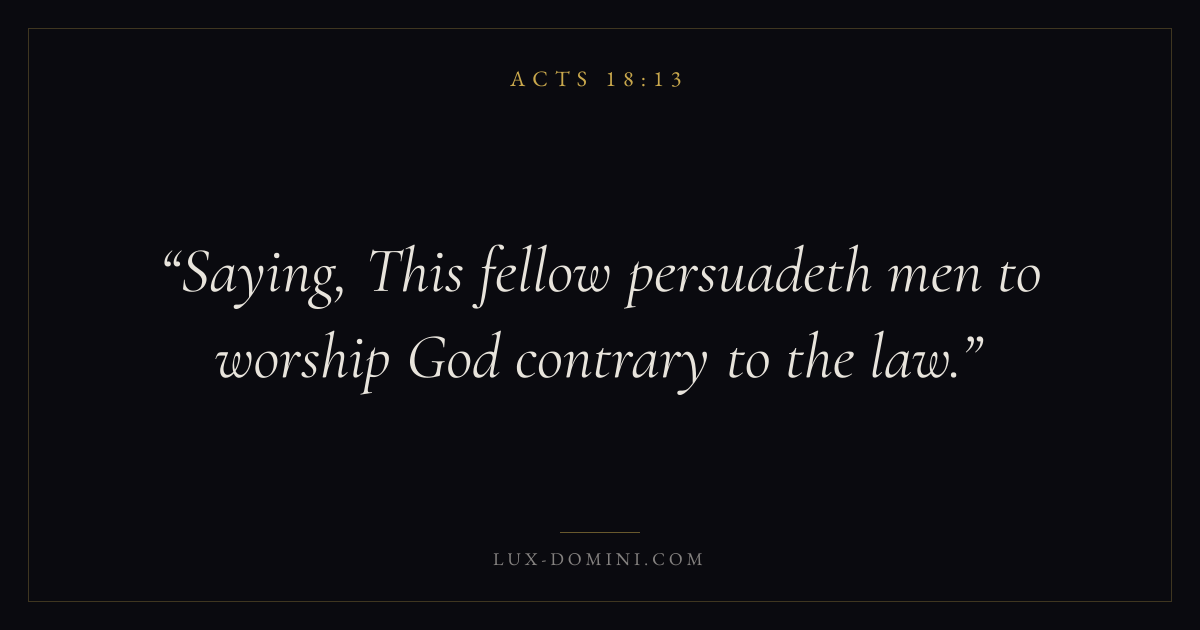 Books / Acts / Chapter 18 / Verse 13 ← Acts 18:12 Acts 18:13 Acts 18:14 → Saying, This fellow persuadeth men to worship God contrary to the law. Download verse card Share on Twitter Share on Facebook Pin it ✦ Key themes Suffering and trialsPrayerJustice and mercyTruthSpirit Read with Acts 18:12Acts 18:14Romans 8:182 Corinthians 4:17 Related topics Bible verses about suffering and trialsBible verses about prayerBible verses about justice and mercyBible verses about truth ✦ Acts Chapter 18 verses V. 1 V. 2 V. 3 V. 4 V. 5 V. 6 V. 7 V. 8 V. 9 V. 10 V. 11 V. 12 V. 13 V. 14 V. 15 V. 16 V. 17 V. 18 V. 19 V. 20 V. 21 V. 22 V. 23 V. 24 V. 25 V. 26 V. 27 V. 28