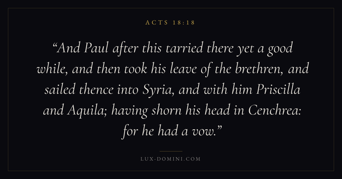 And Paul after this tarried there yet a good while, and then took his leave of the brethren, and sailed thence into Syria, and with him Priscilla and Aquila; having shorn his head in Cenchrea: for he had a vow.