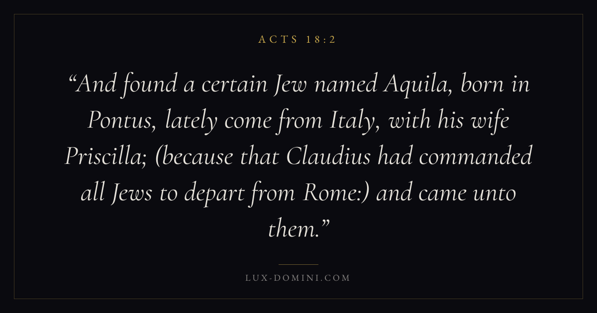 And found a certain Jew named Aquila, born in Pontus, lately come from Italy, with his wife Priscilla; (because that Claudius had commanded all Jews to depart from Rome:) and came unto them.