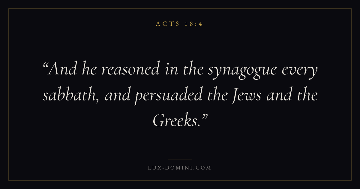 Books / Acts / Chapter 18 / Verse 4 ← Acts 18:3 Acts 18:4 Acts 18:5 → And he reasoned in the synagogue every sabbath, and persuaded the Jews and the Greeks. Download verse card Share on Twitter Share on Facebook Pin it ✦ Key themes Suffering and trialsPrayerTruthSpirit Read with Acts 18:1Acts 18:2Romans 8:182 Corinthians 4:17 Related topics Bible verses about suffering and trialsBible verses about prayerBible verses about truth ✦ Acts Chapter 18 verses V. 1 V. 2 V. 3 V. 4 V. 5 V. 6 V. 7 V. 8 V. 9 V. 10 V. 11 V. 12 V. 13 V. 14 V. 15 V. 16 V. 17 V. 18 V. 19 V. 20 V. 21 V. 22 V. 23 V. 24 V. 25 V. 26 V. 27 V. 28