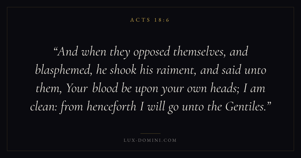 And when they opposed themselves, and blasphemed, he shook his raiment, and said unto them, Your blood be upon your own heads; I am clean: from henceforth I will go unto the Gentiles.