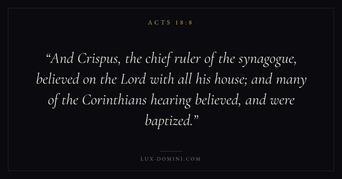 And Crispus, the chief ruler of the synagogue, believed on the Lord with all his house; and many of the Corinthians hearing believed, and were baptized.