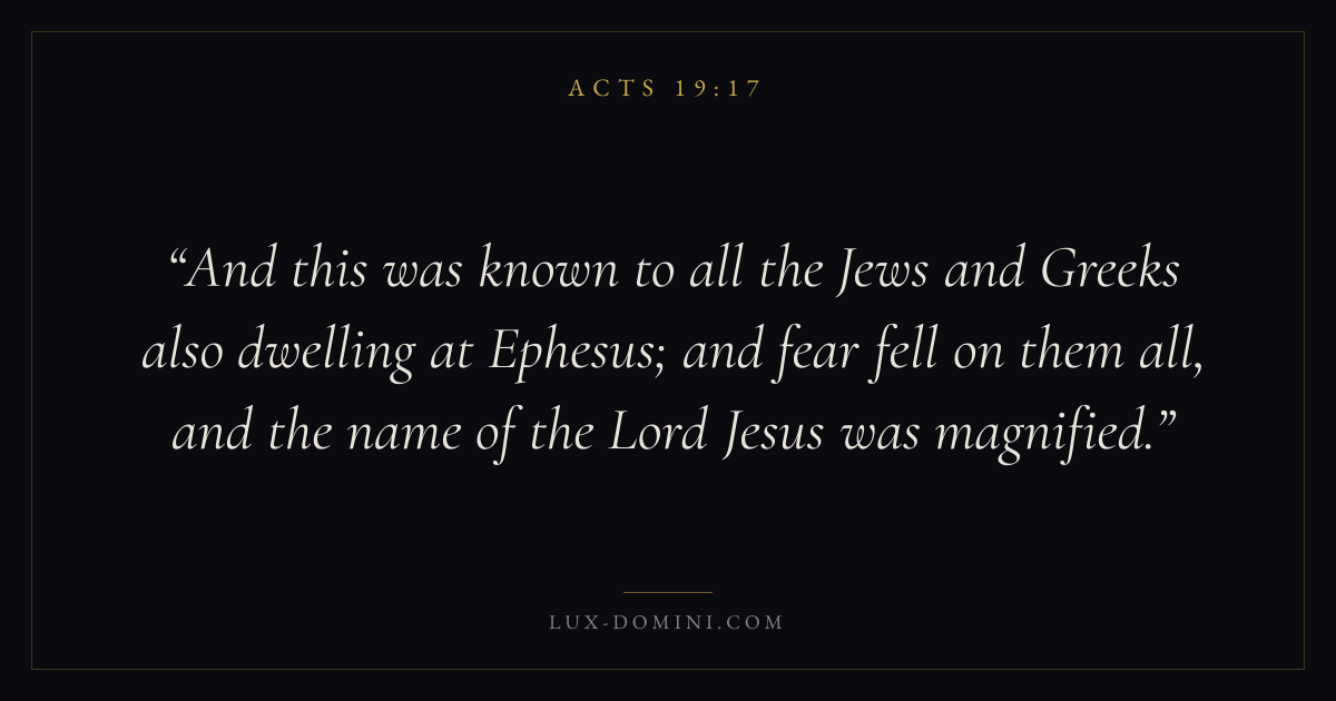 And this was known to all the Jews and Greeks also dwelling at Ephesus; and fear fell on them all, and the name of the Lord Jesus was magnified.