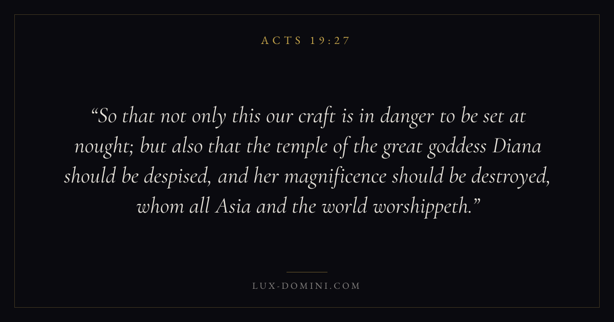 So that not only this our craft is in danger to be set at nought; but also that the temple of the great goddess Diana should be despised, and her magnificence should be destroyed, whom all Asia and the world worshippeth.