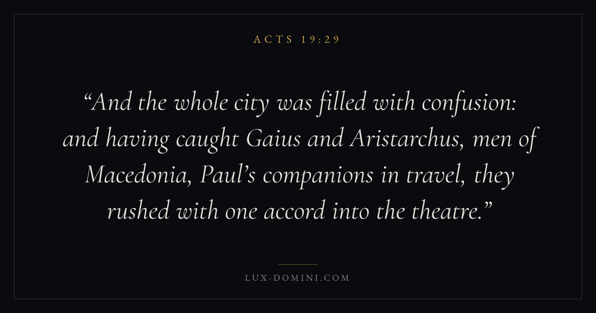 And the whole city was filled with confusion: and having caught Gaius and Aristarchus, men of Macedonia, Paul’s companions in travel, they rushed with one accord into the theatre.